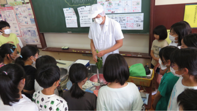 地域の方をお呼びしてバケツへ稲を植える活動を行いました。普段はなかなかできない活動なので講師の方の説明を子供たちは目を輝かせて聞いていました。