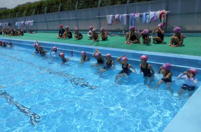 中居小のプールに、2年生の明るく元気な声が響いています。