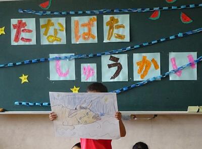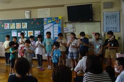 7月5日(水)に七夕集会を行いました。七夕集会では、「夢をかなえてドラえもん」の歌に合わせてリズム打ちをしたり、リコーダーや鉄琴、鍵盤ハーモニカ、ハンドベルを使って「きらきら星」の合奏をしたりしました。また、1組は七夕クイズ、2組は七夕物語の紙芝居、3組は星座についてパネルと音読での発表、4組は七夕物語の劇、5組は星座についてパワーポイントでの発表を行いました。七夕集会に向けて準備や練習を重ね、本番当日みんな一生懸命発表しました。