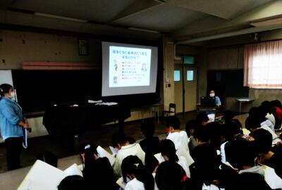 4年生の総合的な学習の時間「心にもバリアフリー」」で、高齢者福祉について出前授業をしていただきました。みなしっかりとメモを取りながら聞きました。