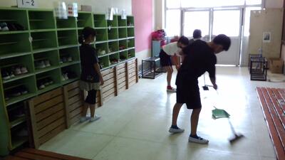 1年生の昇降口掃除は6年生が担当しています。
