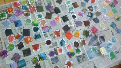 色の組み合わせや混ぜ方を考えながら、色カードを作っていました。